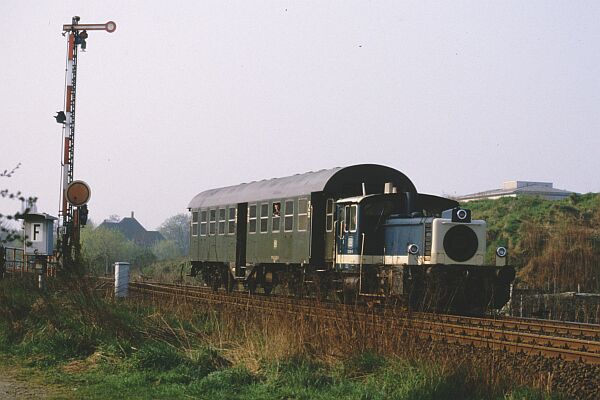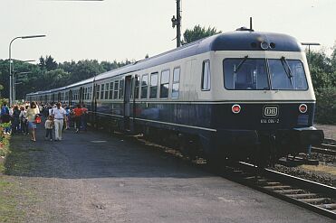 Schulausflug: Ein fünfteiliger (!) 614 brachte am 08.09.88 eine Braunschweiger Grundschule nach Knesebeck, hier bei der An- kunft in Gliesmarode am Nachmittag. | Eine offizielle Streckenbereisung Braunschweig - Uetze durch einige Herren der BD Hannover gab es am 21.04.88: 333 191 hat statt den üblichen Güterwagen einen "Byg" am Haken. Der planmäßige Personenverkehr auf dieser Strecke wurde bereits 1962 eingestellt. | |