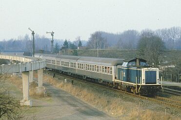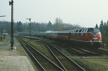 "Abschied von der V 200" hieß es am 14.04.84: Die Zugpaare E 3217 / E 3230 (vergl. Fotoseite "Heckeneilzüge") waren bis 1983 planmäßig mit den Lübeckern V200 bespannt, die bis Bad Harz- burg durchliefen. Schon als Museumslok aufgearbeitet zieht V200 007 den E 3230 durch Gliesmarode Richtung Uelzen, neben den 5 planmäßigen sind 3 Sonderwagen mit im Zug. | |