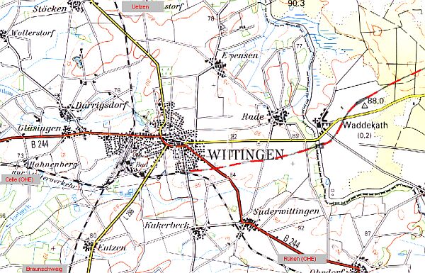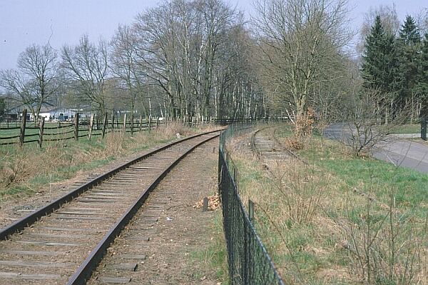 Das Ende: Östlich Wittingen schnitt die Altmärkische Eisenbahn-AG (so hieß die Kleinbahn Bismark - Gardelegen - Wittingen ab 1937) die Landesgrenze am Haltepunkt (oder Bahnhof?) Waddekath-Rade. Wann genau hier der Betrieb eingestellt wurde ist in den einschlägigen Quellen nicht angegeben, es dürfte wohl mit dem Einmarsch der alliierten Truppen im April 1945 der Fall gewesen sein. Zuletzt fuhren werktags 3 und sonntags zwei gemischte Zugpaare (GmP). Schon bald fiel der eiserne Vorhang nur 3 km östlich von Wittingen... Die Spurensuche: Im Rahmen einer Fototour per Rad im Raum Wittingen ergab sich im Frühjahr 2002 ein Abstecher an die ehemalige innerdeutsche Grenze. "Bewaffnet" u.a. mit einer topografischen Karte (s.o.) sollte der Verlauf der 1945 eingestellten Strecke bis zu Landesgrenze nachvollzogen werden - für die gesamte Strecke bis Diesdorf (12km) reichte die Zeit leider nicht. Also zunächst der Bahnhof Wittingen West (heute OHE): Wie auf einem Vorkriegs-Gleisplan leicht zu erkennen hatte hier jede der 3 Kleinbahnen ihren eigenen Gleise und die 3 Strecken (Richtung Celle, Oebisfelde (heute bis Brome/Rühen) und Diesdorf) verzweigten sich noch im Bahnhofsbereich. Besonders auffällig war der über ca. 2 Kilometer parallele Verlauf der Strecken Richtung Oebisfelde und Diesdorf bis zum Haltepunkt Wittingen Süd! Schon in der südlichen Bahnhofsausfahrt findet man neben dem heute noch befahrenen Bromer Gleis ein auffällig parallel verlegtes Anschlußgleis: Die ehemalige Diesdorfer Bahn, dem Gleiszustand zu urteilen wohl auch noch der orginale Vorkriegs-Oberbau (siehe Bild).