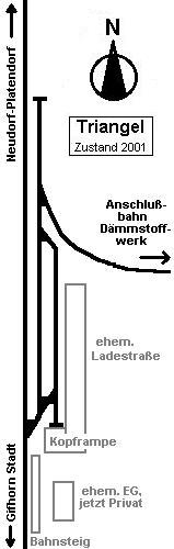 Der heutige Haltepunkt Triangel war bis Ende der 80er-Jahre ein Bahnhof mit Ausweichgleis, Ladestraße und Ein-/Ausfahrsignalen, weiterhin gab es 2 Übergabegleise für die Anschlussbahn zum Dämmstoffwerk. Nach dem