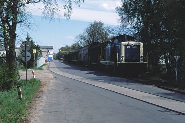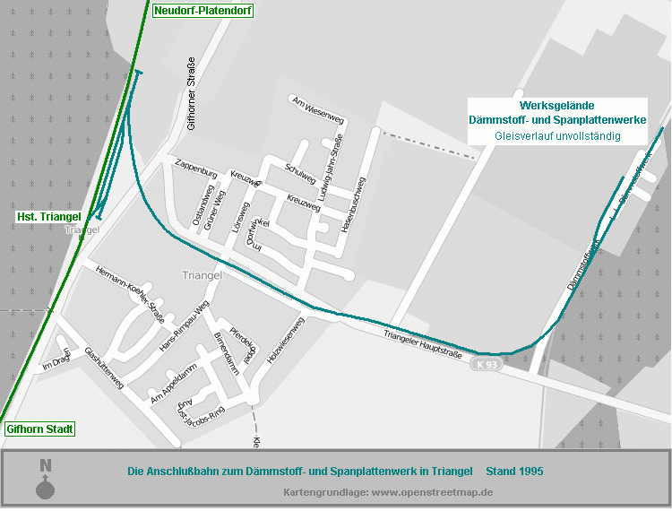 ![]() Die zuletzt rund 2 Kilometer lange Anschlußstrecke vom Bahnhof Triangel zum Dämmstoffwerk (TDW) entstand bereits kurz nach der Inbetriebnahme der Strecke Gifhorn - Triangel 1889. Sie führte vom Bahnhof Triangel durch den gleichnamigen Ort zum östlich gelegenen Werksgelände und darüber hinaus rund 4 Kilometer Richtung Nordosten in das große Moor hinein. Für die Torfabfuhr gab es dort mehrere Verladestellen, an denen der gewonnene Torf von der Feldbahn auf die Normalspur umgeladen wurde. Ab 1896 existierte ein torfbefeuertes Kraftwerk im Bereich des Werksgeländes für die umliegenden Betriebe, hier wurden in den folgenden Jahrzehnten u.a. Torf-Dämmplatten hergestellt. In den 60er-Jahren stellte man den Abschnitt großes Moor - Werksgelände ein, das Gleis wurde jedoch nicht abgebaut und liegt dort heute noch (die Torfgewinnung erstreckt sich heute nur noch auf Restflächen, die Abfuhr erfolgt mit einer Feldbahn zum Verarbeitungsbetrieb ins östlich gelegene Westerbeck, vergl. Sonderseite). Das Industriegebiet Triangel hatte nun nichts mehr mit dem Rohstoff Torf zu tun, die beiden Hauptbetriebe Dämmstoff- und Spanplattenwerk wurden aber weiterhin per Bahn vom Bahnhof Triangel aus bedient. Hierfür gab es seit 1915(?) eigene Lokomotiven (voher Pferdebetrieb!), die letzte wurde 1967 außer Dienst gestellt und befindet sich heute beim Verein Braunschweiger Verkehrsfreunde. Ab 1967 wurde der Betrieb von der Bundesbahn abgewickelt. In der zweiten Hälfte der 80er-Jahre wurde der Bahnhof Triangel rückgebaut, es entfielen Ausweichgleis, sämtliche Signale und die Besetzung mit Personal. Die Anschlußstrecke wurde neu an die verbliebenen Nebengleise angebunden und bis 1998(?) bedient, zuletzt war hier nur noch das Dämmstoffwerk Güterkunde (daher die nur teilweise eintragenen Gleisanlagen in der Karte, es existierten auf dem großen Gelände noch weitere Nebengleise). 2003 begann der Rückbau der Anschlußstrecke, auch die Weichenverbindung zur DB in Triangel verschwand. Die beiden Großbetriebe Dämmstoff- und Spanplattenwerk existieren inzwischen hier ebenfalls nicht mehr, heute wird das Gebiet als Industriepark geführt. Die Ausmaße dieses Geländes sind sehr schön auf dem entsprechenden Google-Luftbild zu erkennen. |