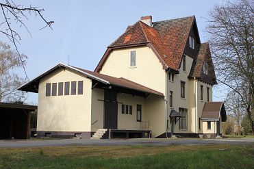 Sehr gepflegt zeigt sich das ehemalige Empfangsgebäude am 12.04.15, hier die Ansicht von der Straßenseite. |