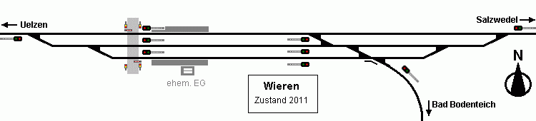 ![]() Eine sehr bewegte Geschichte hat der Bahnhof Wieren aufzuweisen: Im Mai 1873 wurde die Hauptstrecke Uelzen - Salzwedel eröffnet und der Bahnhof Wieren war zunächst für 27 Jahre einfacher Durchgangsbahnhof. Im Juli 1900 wurde hier die Nebenbahn von Braunschweig - Gifhorn kommend angeschlossen und Wieren erhielt die Funktion eines Abzweigbahnhofs. Mit der Grenzziehung 1945 wurde die Strecke Richtung Salzwedel unterbrochen, das Reststück auf westlicher Seite wurde für 54 Jahre zur Stichbahn und endete in Nienbergen kurz vor der innerdeutschen Grenze (Einstellung Personenverkehr 1974, Güterverkehr bis zum Beginn der Lückenschlussarbeiten 1998, zuletzt durch OHE). Die Teilstrecke Uelzen - Wieren wurde auch nach 1945 als zweigleisige Hauptbahn betrieben, erst 1985 verlor sie das zweite Gleis und der Bahnhof Wieren wurde auf das Notwendigste zurückgebaut. Nach der Wende wurde 1998/99 die alte Verbindung nach Salzwedel reaktiviert und elektrifiziert, hierbei erhielt der Bahnhof wiederum ein völlig neues Gesicht. Oberleitung, Lichtsignale und der Entfall sämtlicher Güterverkehrsanlagen charakterisieren seitdem den "neuen" Abzweigbahnhof Wieren, der heute von den Regionalbahnen Uelzen - Braunschweig und Uelzen - Salzwedel - Magdeburg (jeweils im Zweistundentakt) bedient wird. |