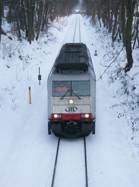 eines beladenen Zuges am 16.02.10 (Aufnahme: M. Else, rechts).