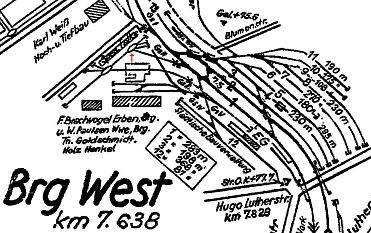 links der Abzweig zum Hafen (Blickrichtung Osten). Im Bauzugdienst