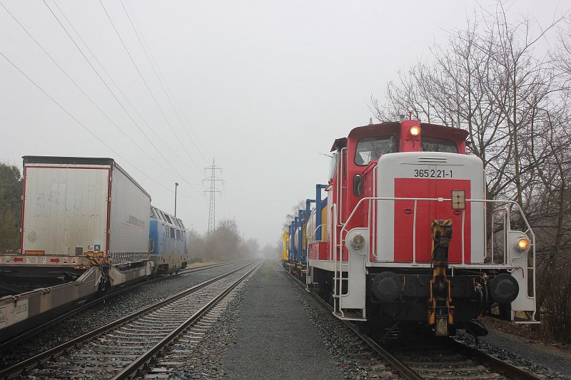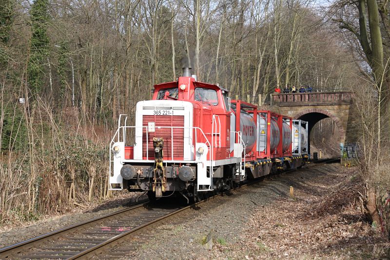 Containerverkehr Braunschweig Hafen - Wolfenbüttel Linden (19.03.17): Auch 2017 verkehrt der Direktzug zwischen Braunschweig Hafen und Wolfenbüttel-Linden mit der 365 221 der BLW (Blöß Lokdienste), hier am 15.03.17 am "Tunnel" Ebertallee kurz vor der Abzweigstelle Lünischteich (Aufnahme: K. Wedemann). |