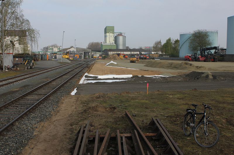 rechts: Am 09.04. wird im Hafen noch an der neuen Umschlagfläche