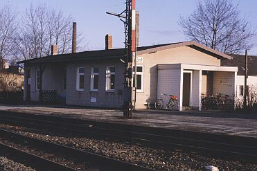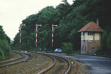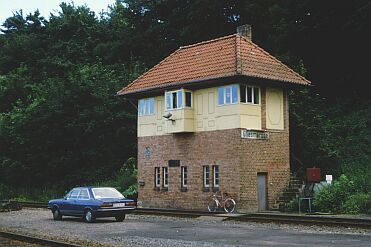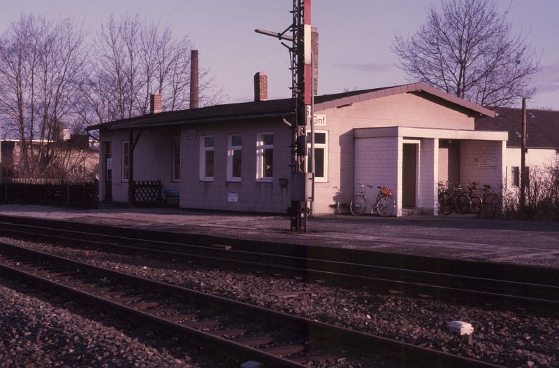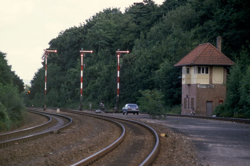 Das Stellwerk Gnf in Einheitsbauweise (Scheidt&Bachmann 1938). Von hier wurden bis 1999 die Signale G, E, F, I, K und H sowie die Weichen 5, 3, 4, 8, 9 und 7 bedient, mittlerweile sind die Signale G und H sowie die Weichen 3, 5, 8 und 9 entfallen (vergl. Skizze unter Bahnhofsbeschreibung). | Blick auf den südlichen Bahnhofsteil mit den Ausfahrsignalen L, M und N an den Gleisen 1, 2 und 3. Das im Hintergrund sicht- bare Lichtvorsignal gehört zur Abzweigstelle Lünischteich (seit Herbst 2003 steht hier ein Vorsignal in KS-Bauart). Signal L wurde im Februar 2006 entfernt, Weiche 1 ist seit 1999 außer Betrieb (vergl. Skizze unter Bahnhofsbeschreibung). | |