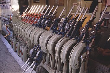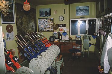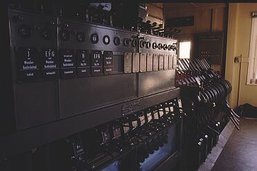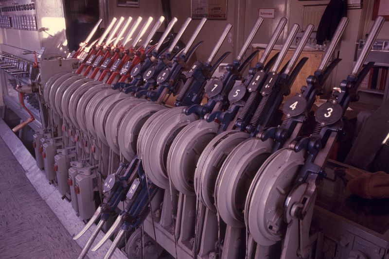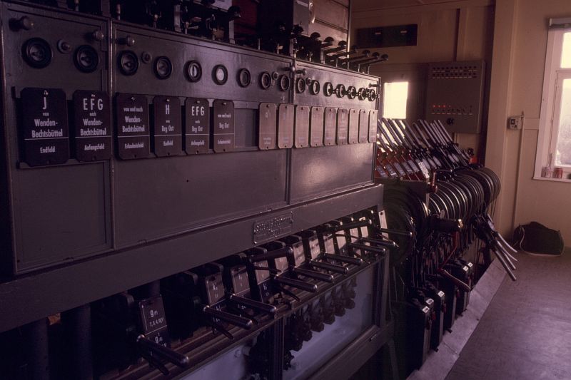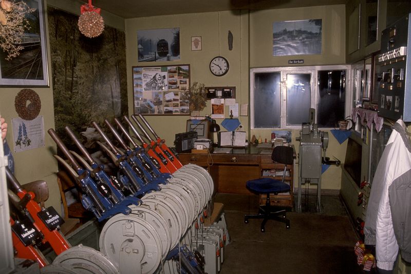 Eine weitere Ansicht von der anderen Seite zeigt u.a. die Signal- winde für das Einfahrsignal I am linken Bildrand. Die Hebelbank ist hier noch vollständig, heute fehlen bereits etliche Teile. | Der Innenraum des Stellwerks Gs mit der Schrankenwinde für den Bahnübergang Grünewaldstraße am rechten Bildrand. Von hier werden aktuell noch die Signale A, M und N sowie die Weiche 2 gestellt. Diese Aufnahme entstand bereits in den 80er Jahren. | |